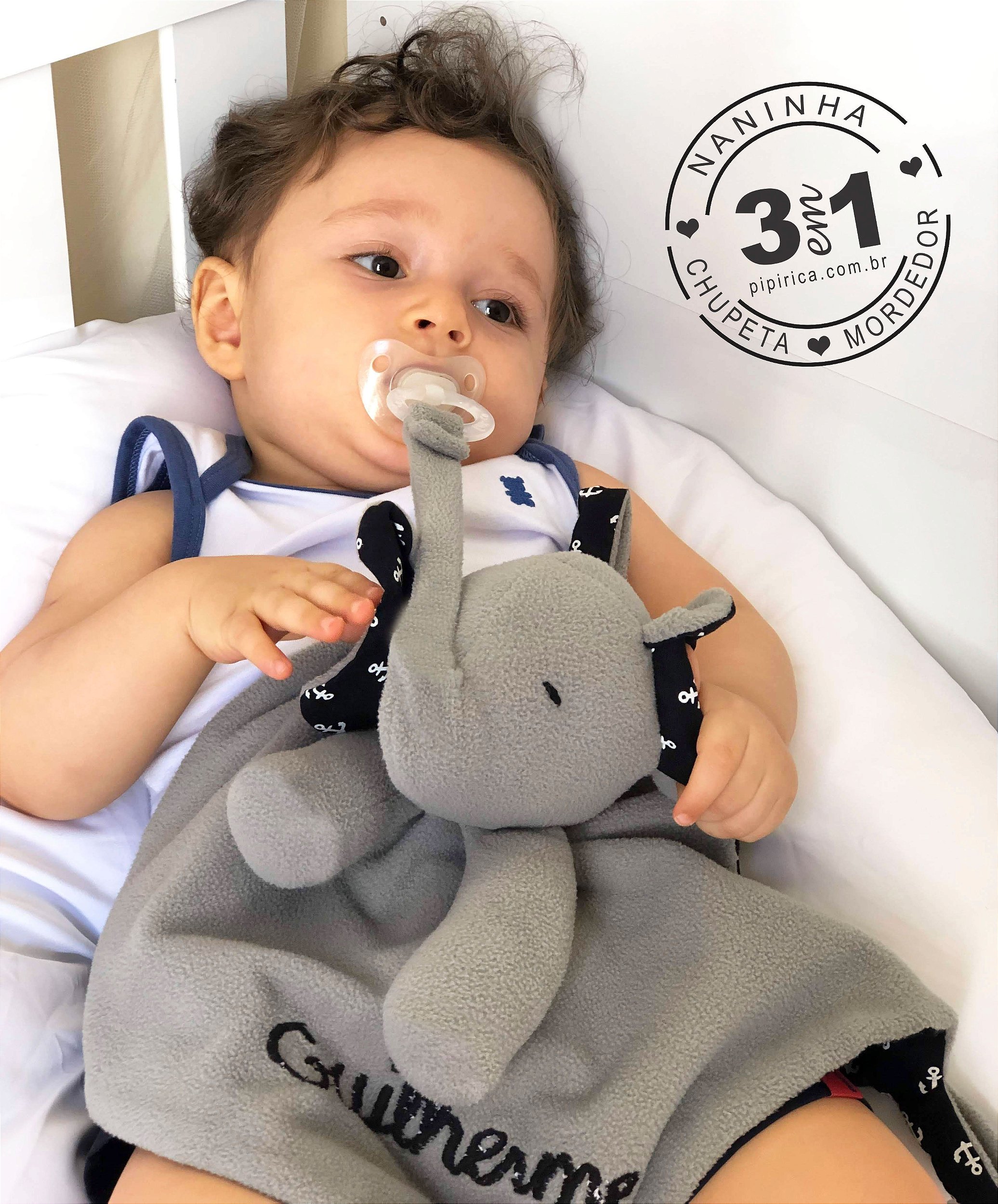 A naninha elefante 3 em 1, da Pipirica, reune em um único objeto a naninha, a chupeta e também mordedor. Mãe já tem que lembrar de levar tantas coisas, mesmo em passeios rápidos como por exemplo, a casa da vovó, que quanto mais prático for, melhor e menos riscos de esquecer itens tão essenciais como esses! Sem contar que, se o bebê perder a chupeta no berço, durante o sono, com a chupeta presa a naninha, fica mais fácil ele achar e se ajeitar sozinho (sem ter que despertar a mamãe)